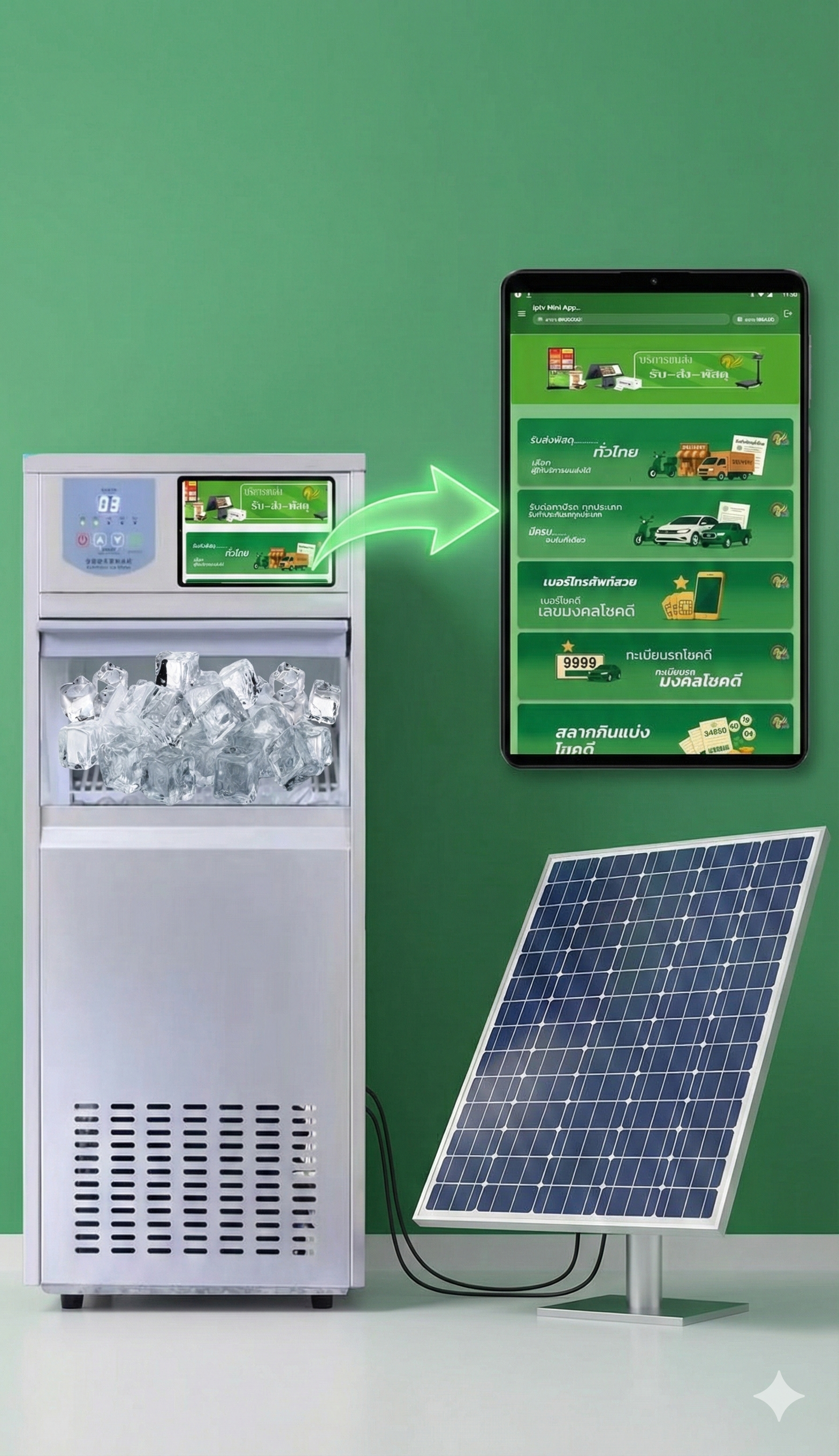 ตู้ทำน้ำแข็ง + ระบบแอปพลิเคชันบริการ (แฟรนไชส์) + พลังงานโซล่าเซลล์
